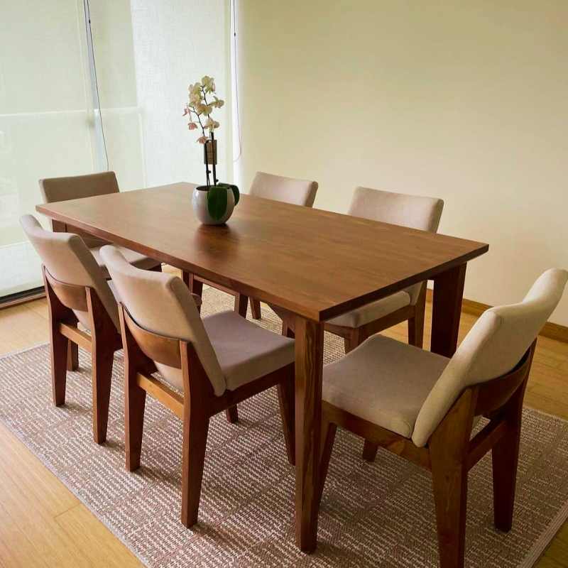 El diseño incluye una mesa amplia con acabados finos que realzan la belleza natural de la madera, acompañada de sillas ergonómicas y cómodas que garantizan una experiencia placentera en cada comida. Disponible en estilos modernos, rústicos o clásicos, este comedor se adapta fácilmente a la decoración de tu hogar, aportando un toque de sofisticación y armonía.